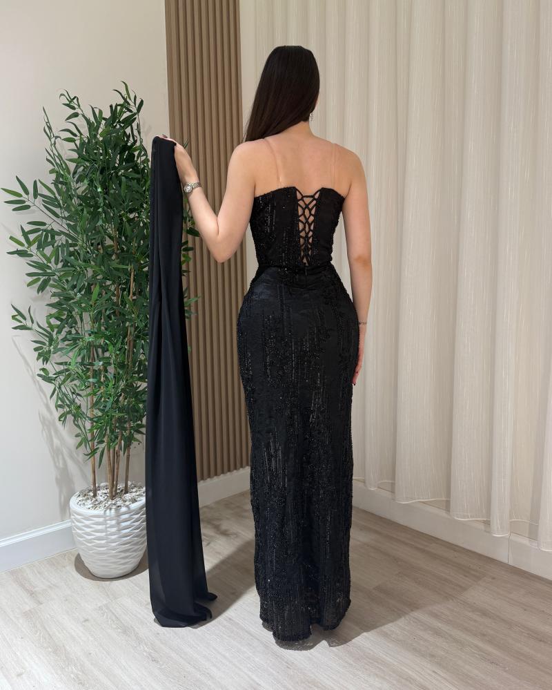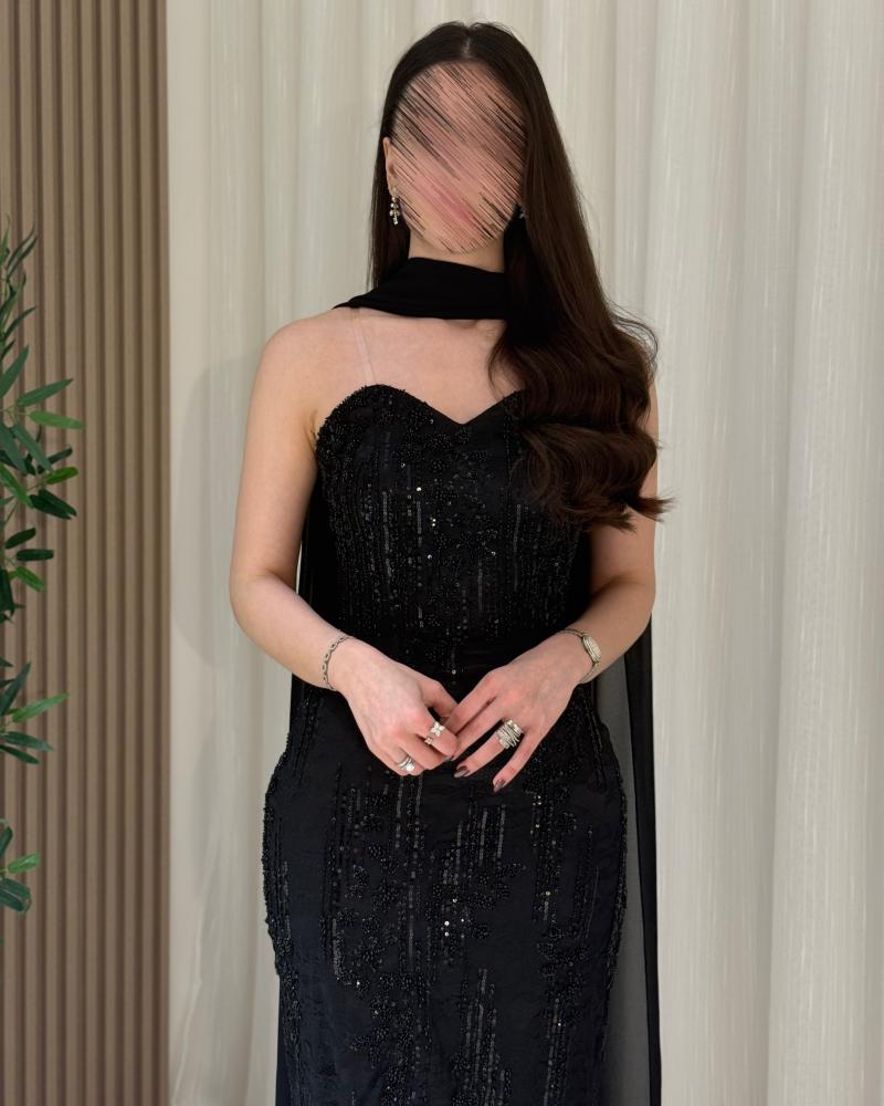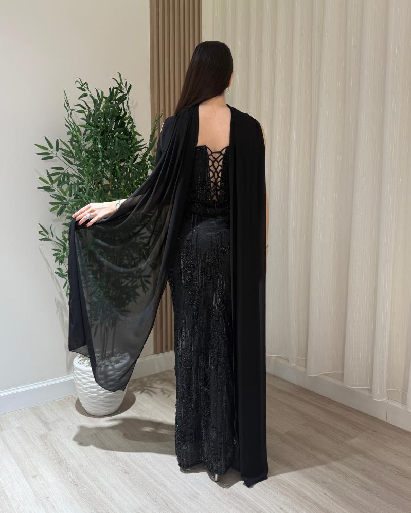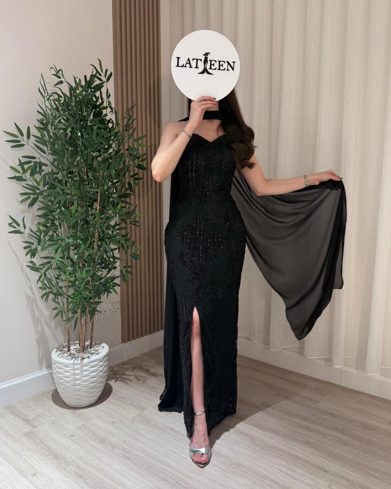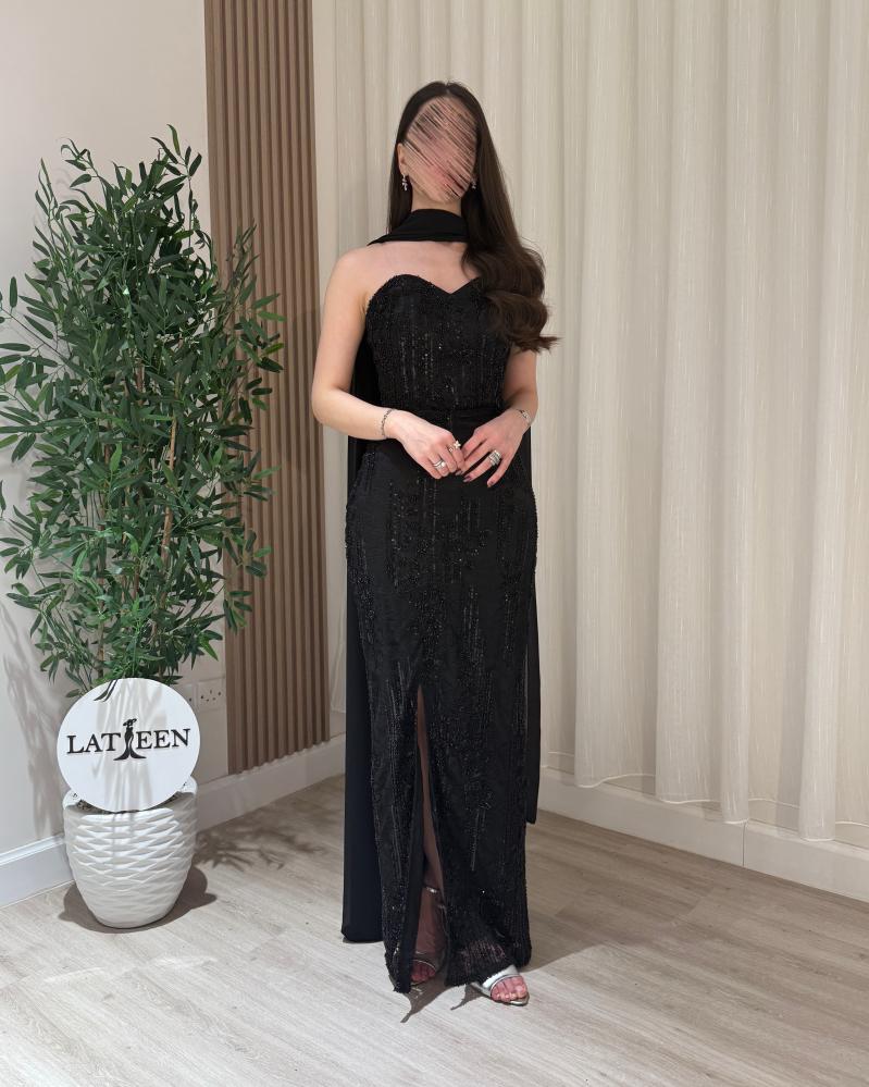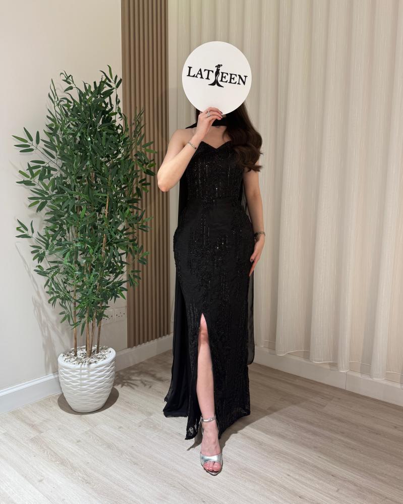 الفستان أسود فخم بتفاصيل قماش تسرّ النظر، مطرّز بخيوط وخرز أسود لامع بطريقة ناعمة ومرتّبة تضيف عمق وأناقة للتصمي