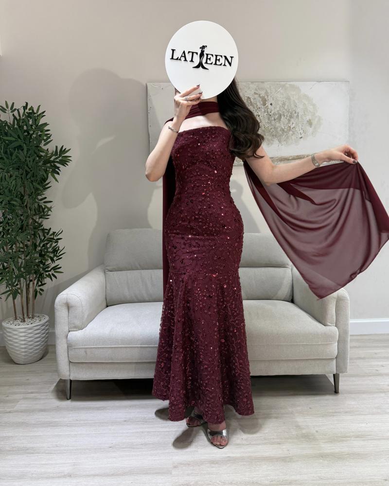 فستان بلون عنابي فاخر، بتصميم ضيّق يبرز القوام، مطرّز بالكامل بالخرز اللامع والترتر بنفس اللون لإطلالة ر