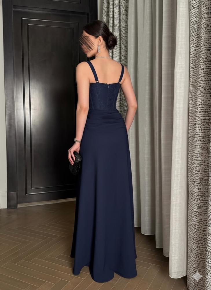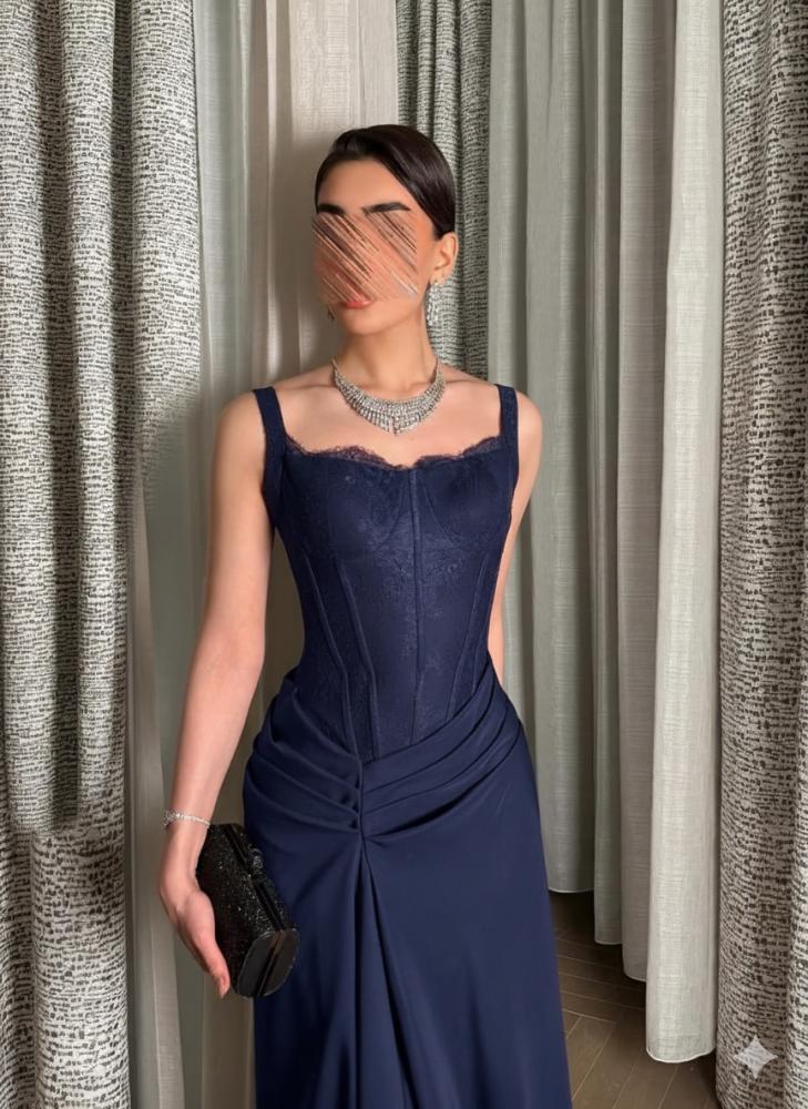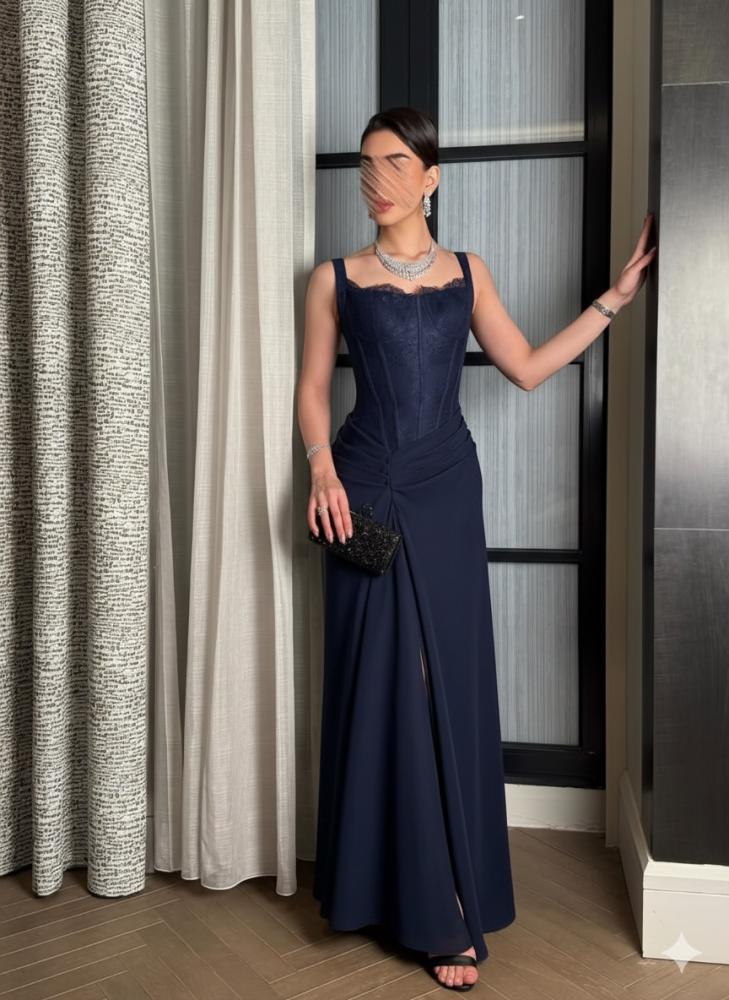 فستان كحلي فخم بتفاصيل دانتيل أنيقة،