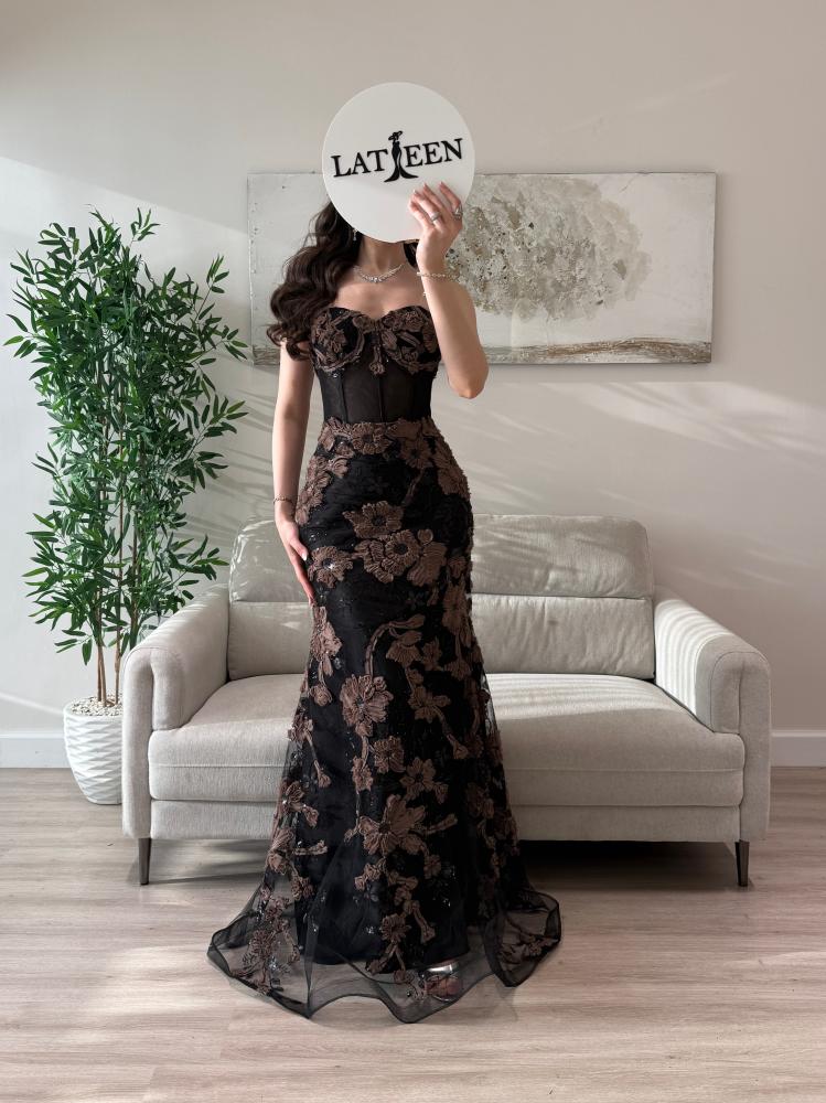يتميز الفستان بلونه الأسود الكلاسيكي المزين بتطريزات بني فاخرة ثلاثية الأبعاد تضيف عمقًا وأناقة مميزة.