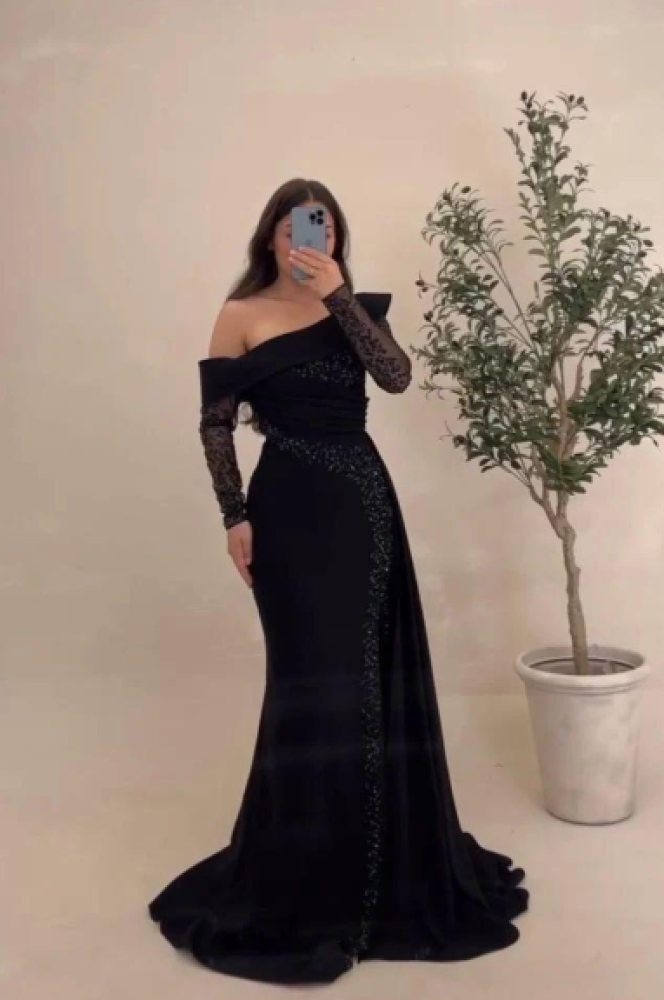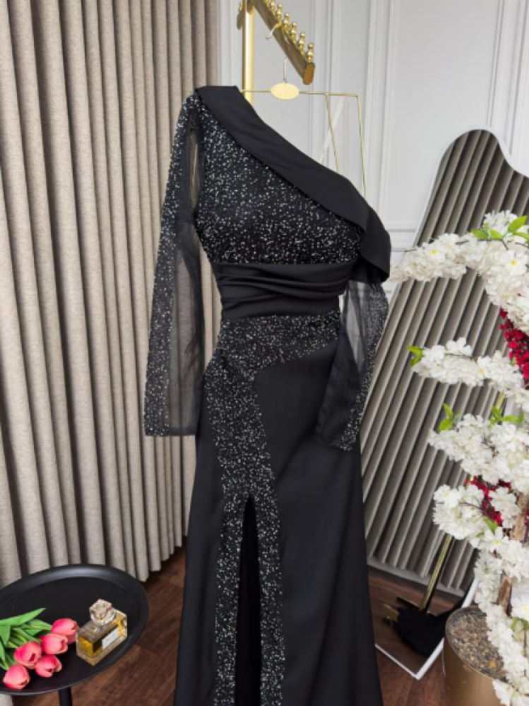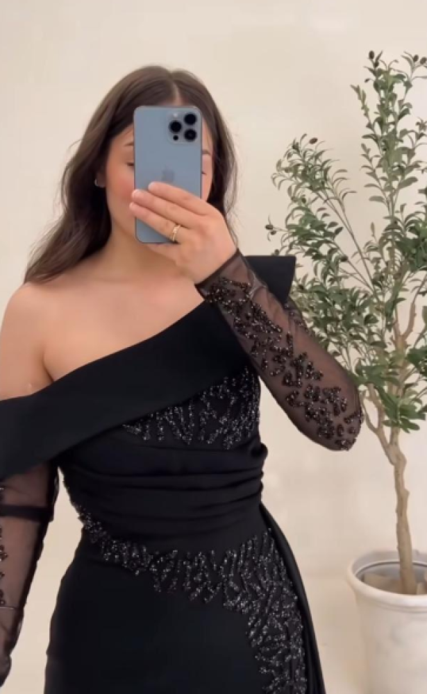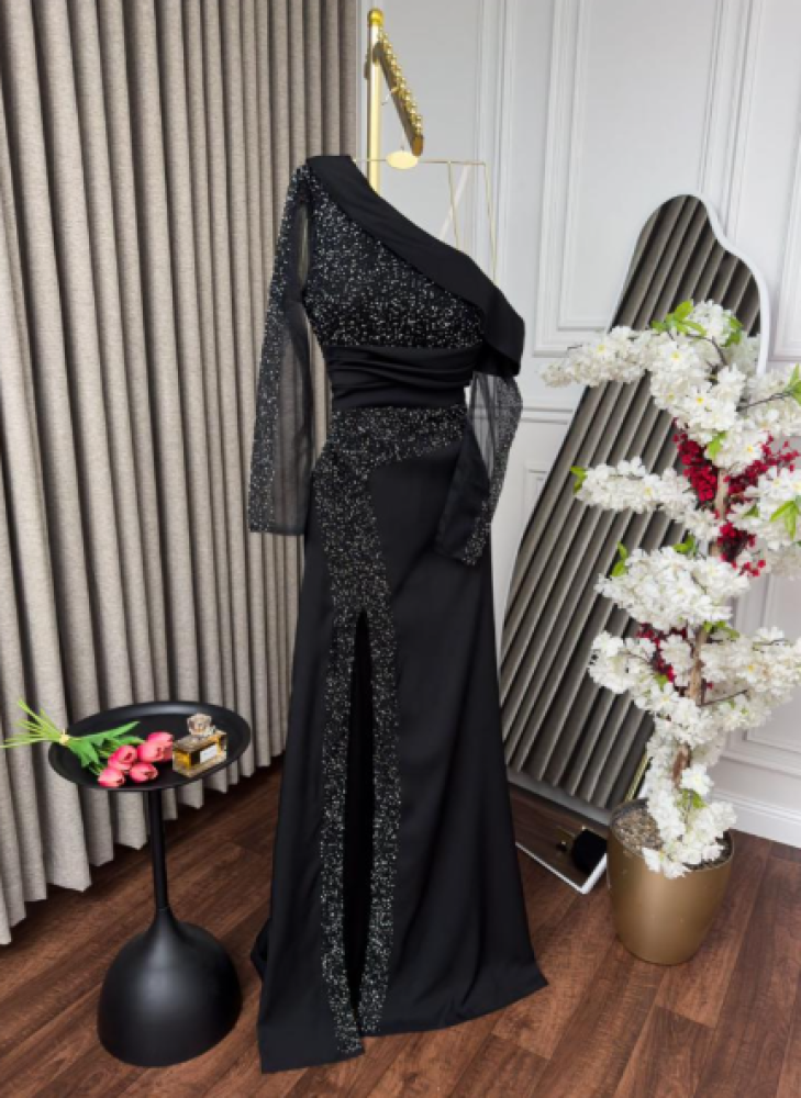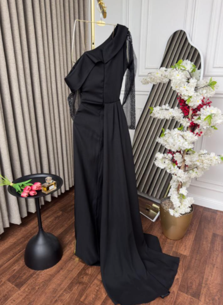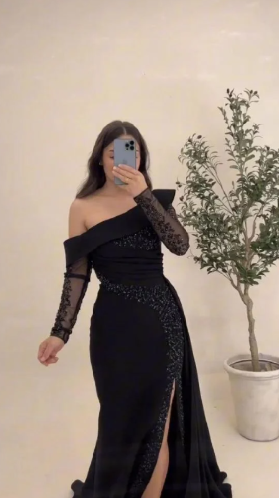 فستان سهرة أسود أنيق بتصميم كتف واحد (وان شولدر) يبرز أنوثتك بكل فخامة.