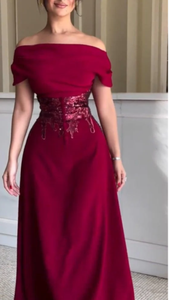 فستان سهرة بلون عنّابي عميق بتصميم أوف شولدر أنثوي راقٍ يبرز الكتفين والرقبة بأناقة مميزة.
