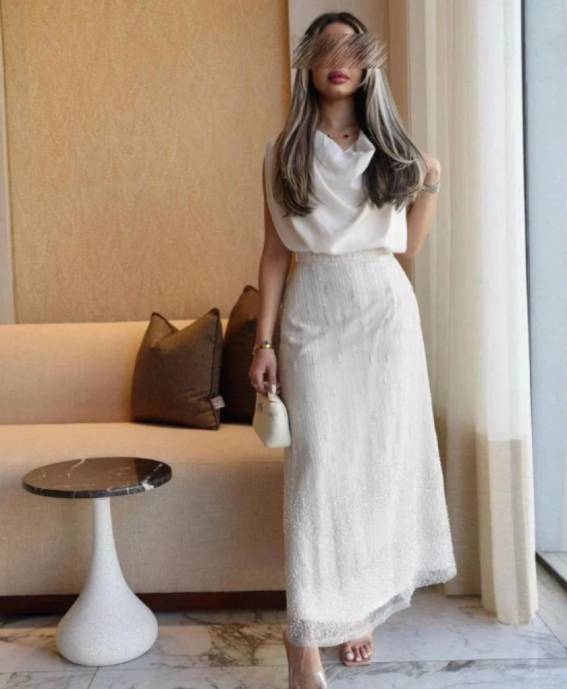 فستان أبيض بتصميم ناعم وراقي، يتميز ببلوزة حريرية ناعمة بقَصّة draped أنثوية، وتنورة طويلة لامعة بتفاصيل دقيقة تضفي لمسة فاخرة جذابة.