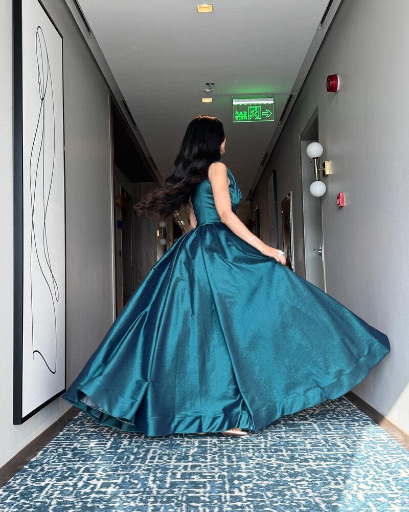 فستان سهرة باللون الأخضر الزمردي بتصميم فاخر وأنيق بكتف واحد يبرز الأنوثة والرقي.