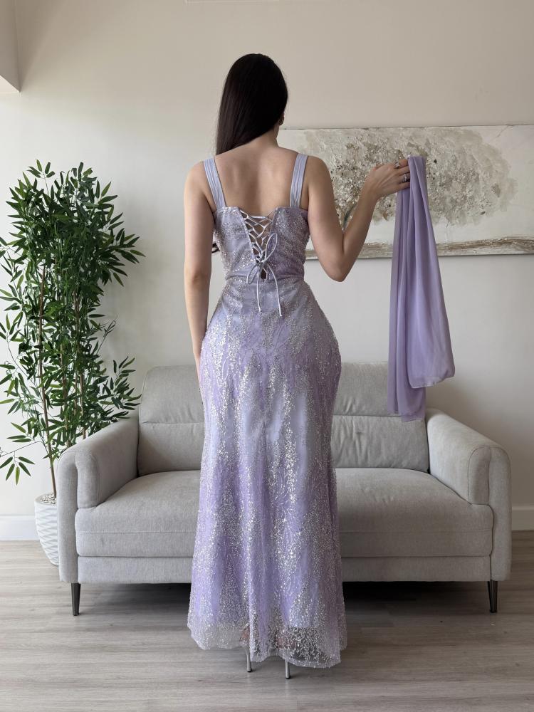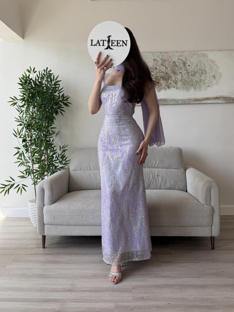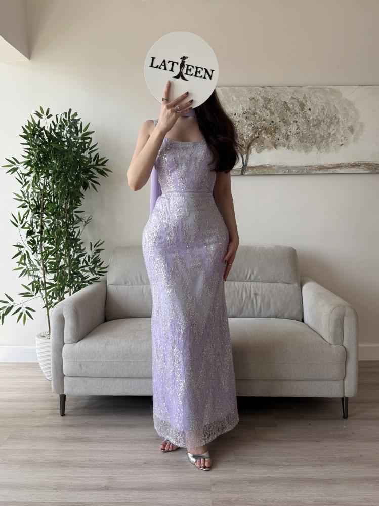 فستان بتصميم راقٍ يجمع بين الأناقة والرقيّ بلون بنفسجي فاتح مطرّز بالكامل بخيوط فضية لامعة تضيف بريقًا ناعمًا تحت الإضاءة.