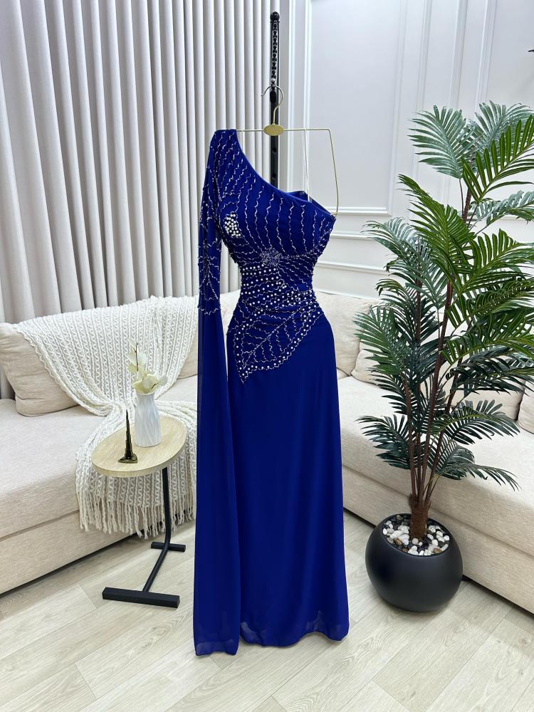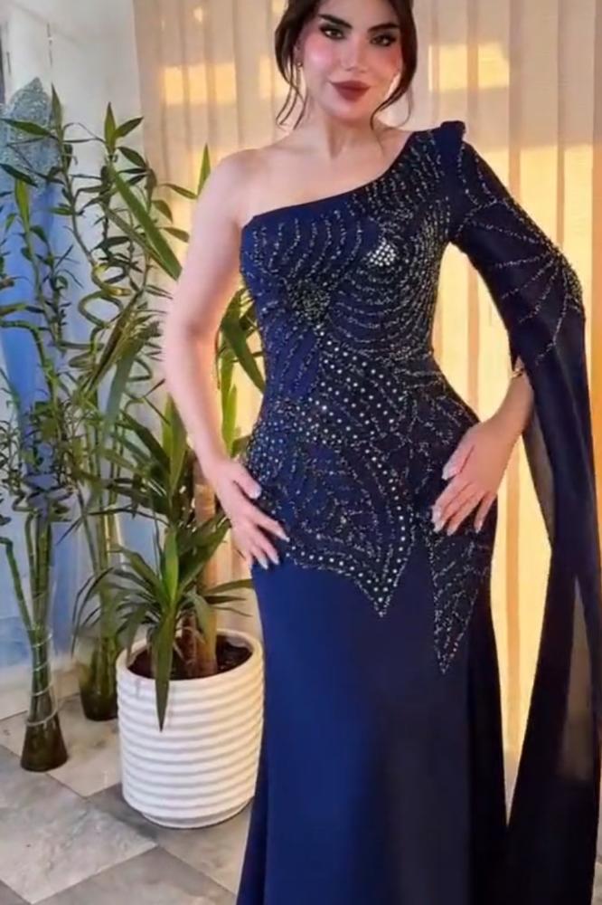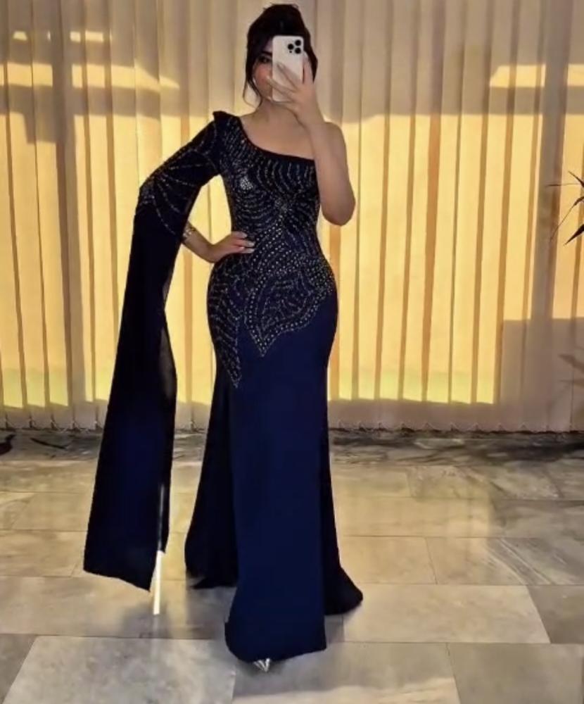 فستان سهرة أنيق بلون أزرق داكن بتصميم كتف واحد (وان شولدر) يجمع بين الجرأة والرقي، مرصّع بالكامل بتطريزات كريستالية لامعة تضيء الإطلالة بأناقة فريدة.