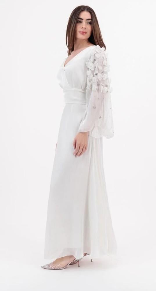 فستان أبيض فاخر بتصميم أنثوي راقٍ يجمع بين البساطة والفخامة.