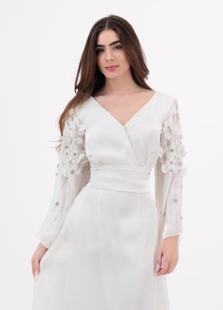 يتميز بأكمام شفافة مزينة بتطريزات ناعمة تمنح لمسة من اللمعان الراقي، مع قصة خصر محددة تُبرز القوام بانسيابية وجمال.